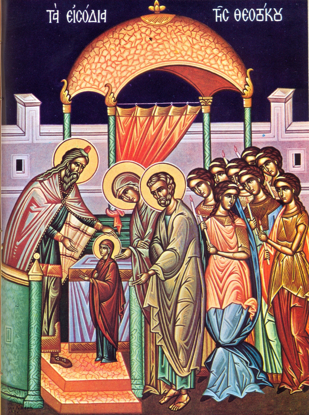 « …Ἄννα ἡ θεία χάρις σαφῶς, χαριτωθεῖσαν τὴν ἁγνὴν Ἀειπάρθενον, προσάγει μετ’ εὐφροσύνης, εἰς τὸν Ναὸν τοῦ Θεοῦ, προσκαλεσαμένη προπορεύεσθαι, αὐτῆς τὰς νεάνιδας λαμπαδηφόρους καὶ λέγουσα· Ἄπιθι τέκνον, τῷ δοτῆρι γενήθητι, καὶ ἀνάθημα, καὶ εὐῶδες θυμίαμα. Εἴσελθε εἰς τὰ ἄδυτα, καὶ γνῶθι μυστήρια, καὶ ἑτοιμάζου γενέσθαι, τοῦ Ἰησοῦ οἰκητήριον, τερπνὸν καὶ ὡραῖον, τοῦ παρέχοντος τῷ κόσμῳ, τὸ μέγα ἔλεος….[1]